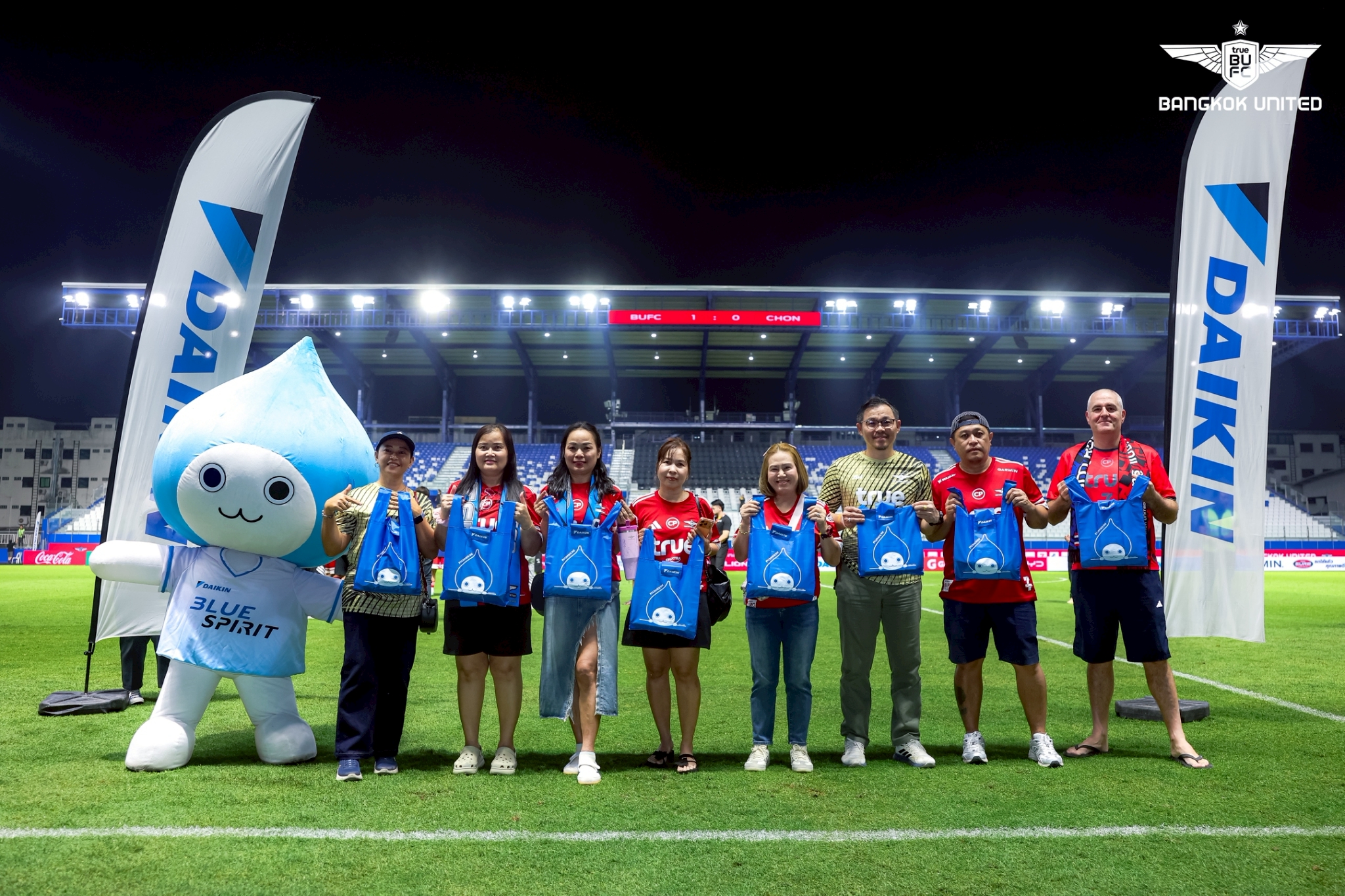 During halftime, Daikin hosted the Blue Spirit Lucky Camera activity, where cameras randomly selected fans from the stands to perform the “Blue Spirit” signature pose alongside Pichon-kun, Daikin’s mascot. Fans who performed the pose most closely received special prizes from Daikin, with a total of eight lucky winners joining Pichon-kun for prize presentations and commemorative photos on the field after the match.